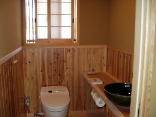 和室を主に玄関ホール、広縁、客用便所は、和風に仕上ました。 客用便所は腰板を貼り、カウンターには露天風呂と同じ信楽焼きの手洗器がつきました。 茶室として使えるように和室には炉を作り、壁には白い奉書紙で腰張をしています。 丸窓横の茶道口の向こうが水屋にです。 水屋棚は杉板を使って作りました。 当初は”見せない水屋”ということでしたが、出来上がりを見るともったいない感じが... 是非茶道具を飾ってお客さまに披露して頂きたいです。(^^) |